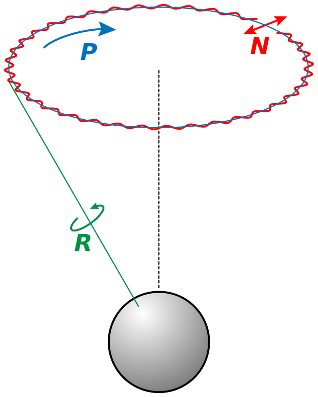 Die Erdachse ist um 23.5 Grad gegen die Bahnebene (Ekliptik) geneigt, aber die Sonne und der Mond (natürlich auch, wie bereits erwähnt in geringerem Maße, die anderen Planeten) üben Kräfte auf den Äquatorwulst der Erde aus, die versuchen, die Erdachse gegenüber der Bahnebene aufzurichten. Die Erde reagiert auf diese Kräfte mit einer Kreiselbewegung ähnlichen dem Schlingern eines austrudelnden Kinderbrummkreisels. Das passiert sehr langsam aber stetig. Das bedeutet, die Erdachse beschreibt eine Bewegung auf einer Kegelfläche. In etwas über 25000 Jahren läuft diese Kreiselbewegung (Präzession) dabei einmal um. Die Periodendauer der, durch die um 5% zur Ekliptik versetzen Mondbahn, erzeugten „Schlingerbewegungen“ (Nutation), beträgt 18,6 Jahre und ihre Amplitude ist 9,2 Bogensekunden (hier ist das Winkelmaß Grad zu grob, die Darstellung in der Zeichnung ist stark überzeichnet) rechtwinklig zur Ekliptik und 6,8 Bogensekunden parallel zur Ekliptik.