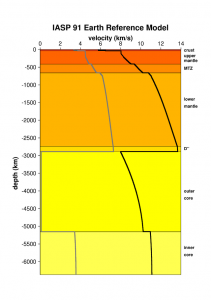 Das IASP91-Referenz-Erdmodell. Die Geschwindigkeiten der P- und S-Wellen sind durch die schwarze bzw. durch die graue Linien wiedergegeben. Farbig unterlegt wird die grobe Gliederung des Erdkörpers angezeigt. „